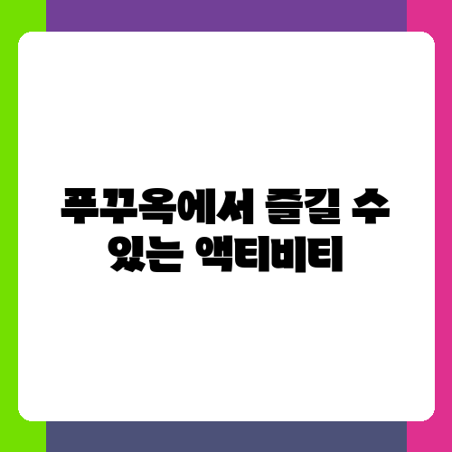 푸꾸옥에서는 다양한 액티비티를 즐길 수 있습니다. 아름다운 해변에서 수영과 일광욕을 즐기거나, 스노클링이나 다이빙을 통해 바닷속 아름다움을 감상하는 것도 좋습니다. 또한, 푸꾸옥 국립공원을 방문하여 자연을 만끽하거나, 밤에는 흥겨운 야시장을 즐겨보세요. 섬 곳곳에 숨겨진 아름다운 풍경을 찾아 떠나는 여행도 추천합니다. 저는 개인적으로 푸꾸옥의 석양이 아름다워서, 해변에서 석양을 감상하는 것을 추천하고 싶어요. 액티비티를 예약할 때는 미리 예약하는 것이 좋고, 투어 업체를 선택할 때는 후기를 확인하고 신중하게 결정하는 것이 중요합니다. 사전에 액티비티를 계획하고 예약하면 더욱 알찬 여행을 할 수 있습니다.