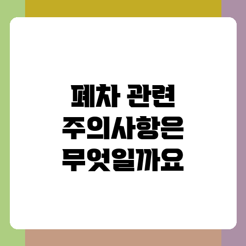 폐차 과정에서 몇 가지 주의해야 할 사항들이 있습니다. 먼저, 폐차 대행 업체를 이용할 때는 업체의 신뢰도를 꼼꼼하게 확인해야 합니다. 불법 폐차 업체를 이용하면 불필요한 비용이 발생하거나 심각한 문제에 직면할 수도 있습니다. 또한, 계약 내용을 꼼꼼하게 확인하고 서류를 보관하는 것도 중요합니다. 폐차 과정에서 발생할 수 있는 모든 상황을 예상하고 미리 대비해야 안전하게 폐차 절차를 마무리할 수 있습니다. 폐차는 처음 진행하는 분들에게는 다소 어렵고 복잡하게 느껴질 수 있어요. 하지만 이 글에서 소개한 내용들을 꼼꼼하게 확인하고 체크리스트를 만들어 진행하면 훨씬 수월하게 폐차 절차를 마무리할 수 있을 거예요.
